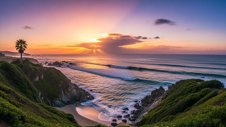 Golden sunset over calm waves at a coastal beach with cliffs and palm trees in the background on a serene evening