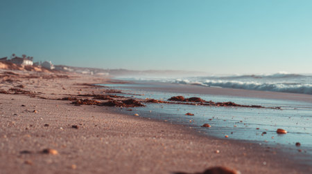 A serene view of a sandy beach with gentle waves rolling in, accentuated by seaweed and smooth stones, under a clear blue sky, perfect for relaxation and travel inspiration.