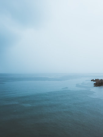 Adriatic sea shoreline during summer tempest shower rain, minimalistic landscape background
