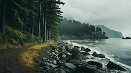 a captivating 32k uhd image showcasing a forest of trees and rocks on a beach. this photograph, inspired by the moody color schemes of the northwest school, captures the beauty of coastal and harbor views. with its environmental portraiture and nature-inspired imagery, this atmospheric picture immerses viewers in the serene and captivating essence of the scene. ai generated