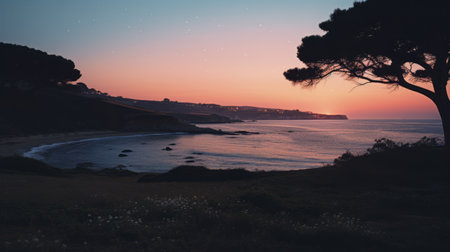 white flowering bushes by the sea, captured in a minimalist style with dark cyan and gold tones. these traditional british landscapes offer serene oceanic vistas, complemented by lush landscape backgrounds. the photo, taken with a webcam, showcases the beauty of the san francisco renaissance. ai generated
