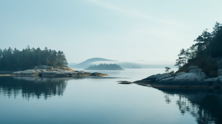 clouds and stones create a serene atmosphere in this captivating photo of a body of water. the hazy landscape, reminiscent of norwegian nature, showcases secluded settings and the beauty of light white and teal tones. the image captures the essence of atmospheric woodland imagery, coastal and harbor views, making it a perfect example of documentary travel photography. ai generated