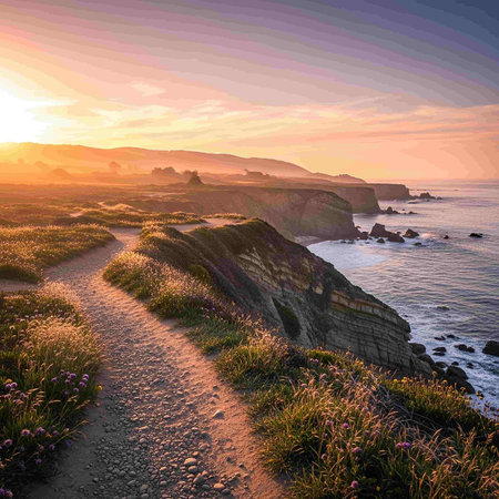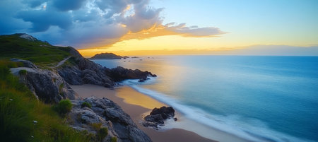 Stunning Coastal Landscape at Sunset, Featuring Dramatic Skies, Rugged Rocks, and Serene Beaches