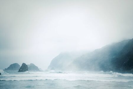 Cliffs Coast Ocean Rocky Green Hills Coastline with Crashing Waves in Misty Weather