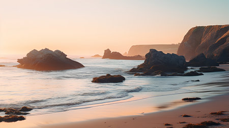 A tranquil seascape view of a beautiful sandy beach and rocky cliffs bathed in the warm, soft light of a setting sun. Gentle waves roll onto the shore.