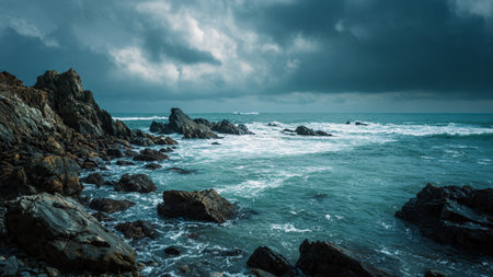 A breathtaking view of a rugged and wild coastline, where dark ocean water swirls around massive grey rocks under a dramatic, cloudy sky. A powerful and scenic natural landscape.