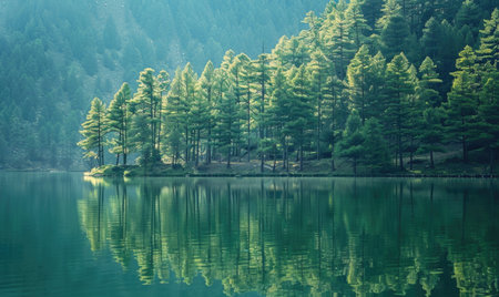 the serene lake's coastal plain stretches calmly between the towering pine trees, offering a tranquil atmosphere and breathtaking scenery, perfect for nature lovers and photographers seeking to capture the beauty of lakeside landscapes and forest surroundings. ai generated