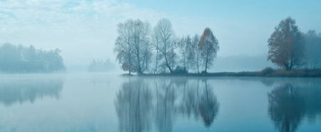 Misty Morning Lake Landscape with Reflective Trees and Tranquil Atmosphere