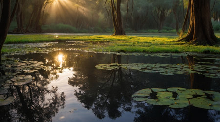 Sunlight filters through trees over calm lake in serene park at golden hour