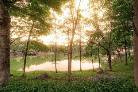 Tropical forest and lake in the morning, Nature background.