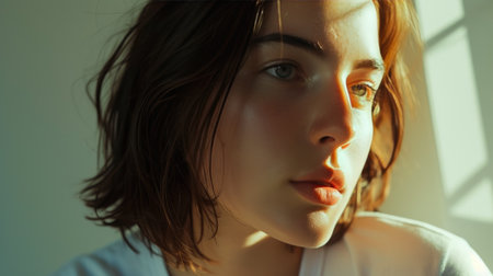 A stunning portrait of a young woman with flowing hair, reflecting natural light. Her serene expression captures a moment of confidence and authenticity.