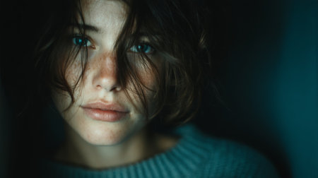 This intimate portrait captures a young woman with freckles framed by soft, natural light. The image evokes emotion and beauty, highlighting her serene expression and delicate features.