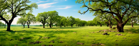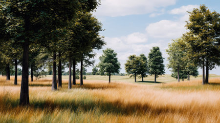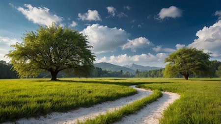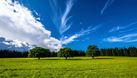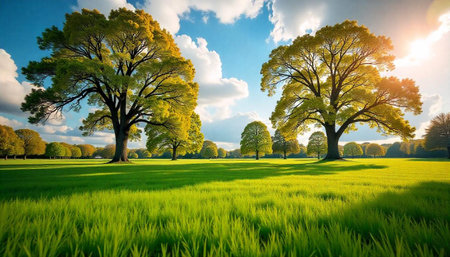 A serene landscape featuring tall, leafy trees in a vibrant green field under a clear blue sky with scattered white clouds.