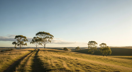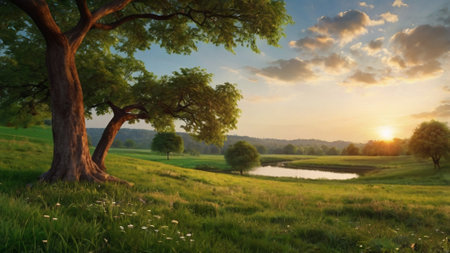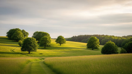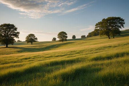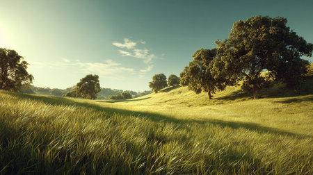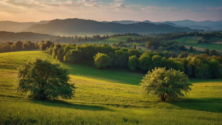 Rolling green hills and trees are bathed in warm golden sunlight creating a soft focus serene landscape.