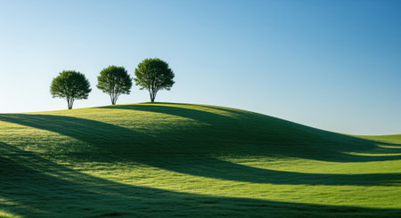 Three trees stand on a vibrant green hill, casting long shadows under a clear blue sky, creating a serene and minimalist natural landscape.