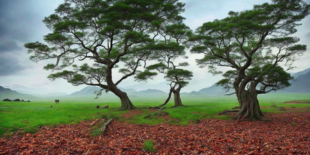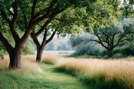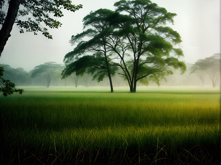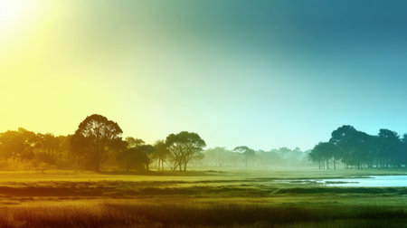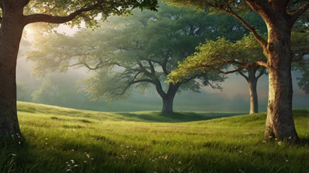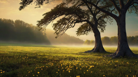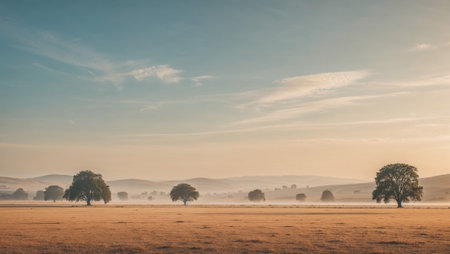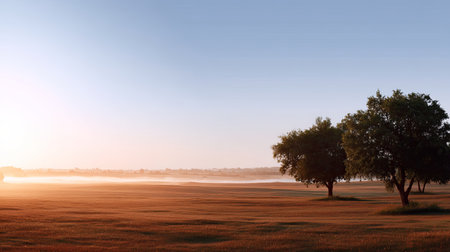Experience a tranquil morning scene with lush trees and soft mist over an expansive field. This serene landscape captures the beauty of nature waking at dawn.