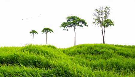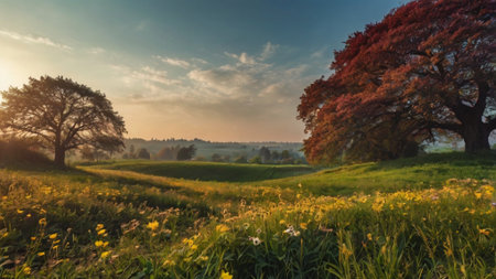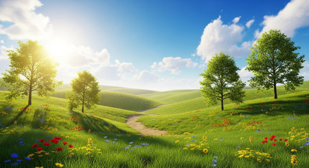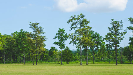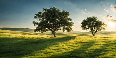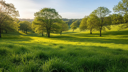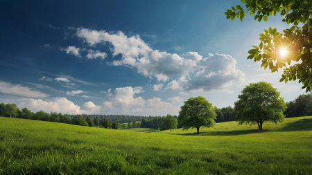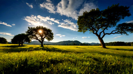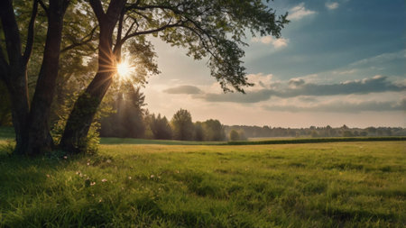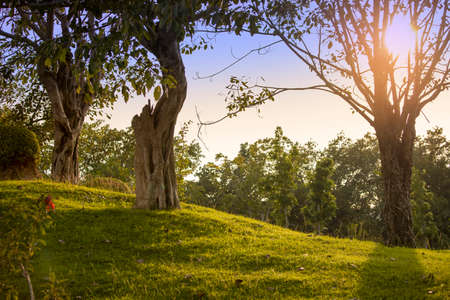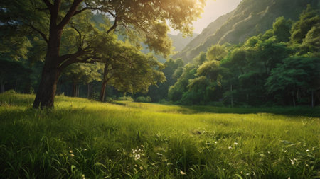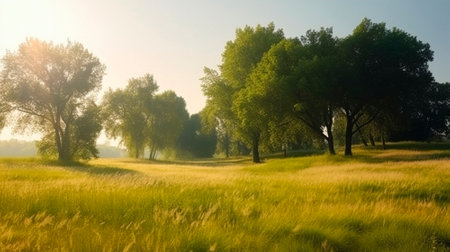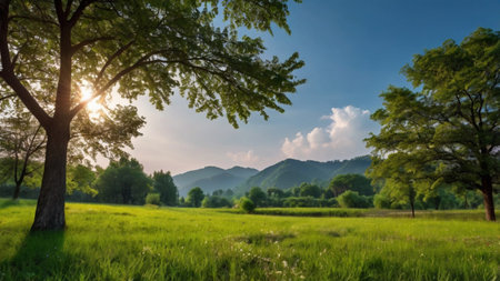 Beautiful green natural scenery background with morning sun and bright sky. concept of nature tranquility