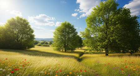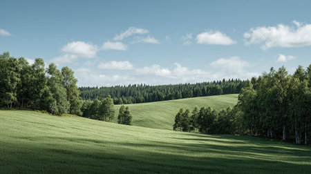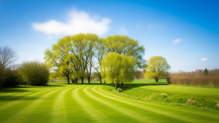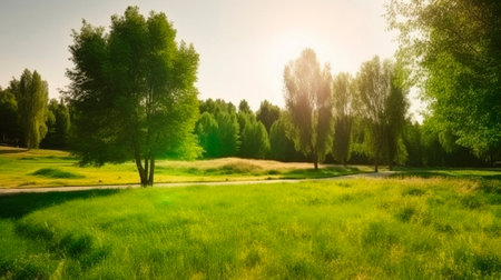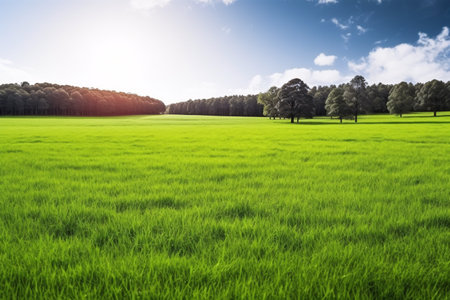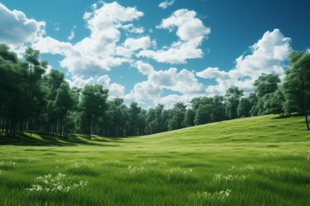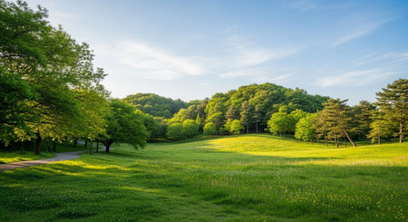 AI Generated. beautiful natural park with a forested area in the background on a green meadow with a beautiful blue sky in high resolution and quality