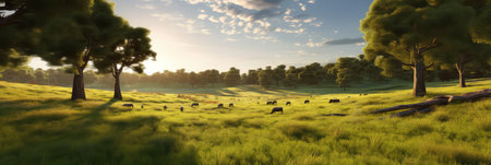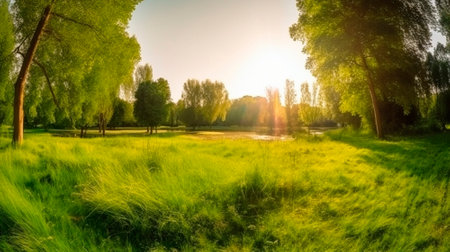 A lush green grassy meadow with tall trees and sunbeams filtering through the leaves during a golden hour sunset in a serene park setting.