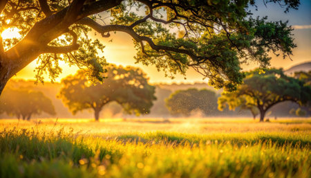 Oak savanna golden hour dust motes suspended shallow depth on grasses representing pastoral warmth and tranquil habitat suitable for nature branding travel inspiration and calming design