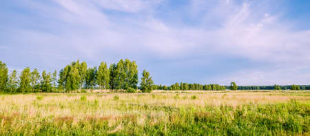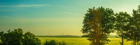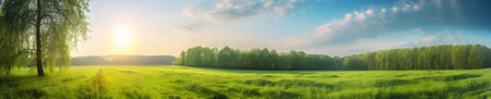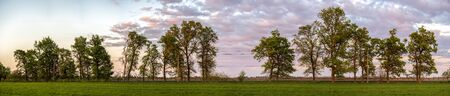 Sunset or sunrise in a summer field with green grass and trees. panoramic landscape.