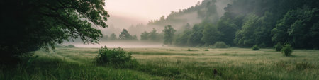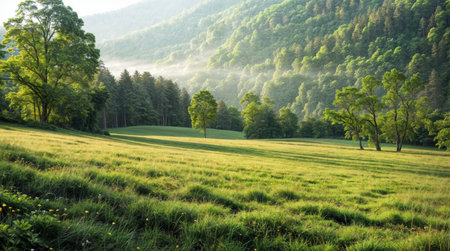 A green meadow mountain landscape evergreen forest morning fog sunrise light nature scenery grassy field tranquil view summer countryside peaceful