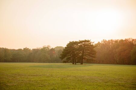 Germany, Frankfurt, Sunrise, Outkirts, a large green field with trees in the background