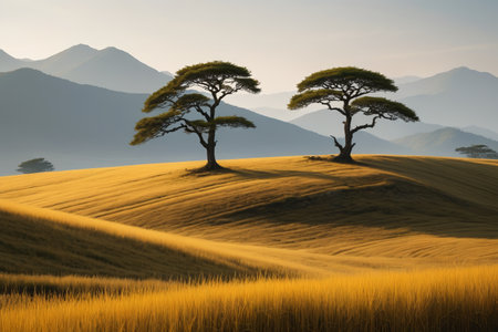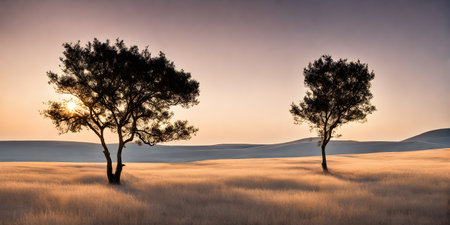 Landscape bathed in the glow of a radiant sun embodied minimalism, featuring just a few sparse elements