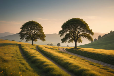 Path showing green rolling hills with a winding dirt path and a large oak tree. resolution use.