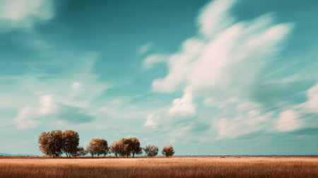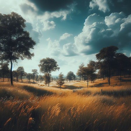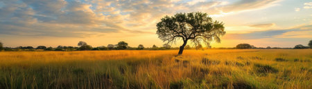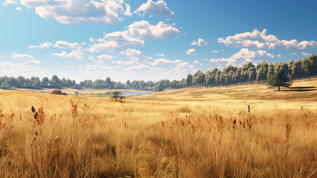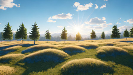 Landscape embracing sunny minimalism, vast open fields stretching towards a horizon kissed by the sun