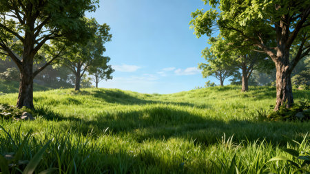 Vibrant summer afternoon scene featuring detailed bright green grass texture on a gentle slope, framed by thick mature tree trunks and leafy canopies against an expanse of light blue sky.