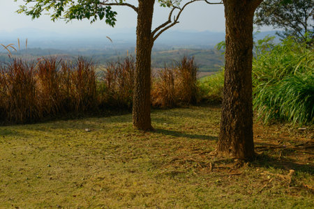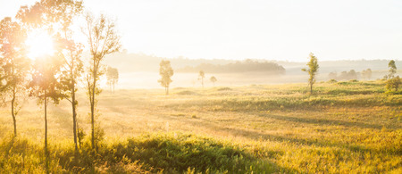 Scenic panoramic landscape. Golden sunrise shines down around the grassland. Spring season. Mountain and golden mist background. Thailand.