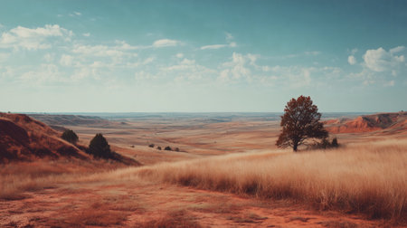 Expansive prairie vista showcasing golden fields, rolling hills, and a solitary tree under a vibrant blue sky in western Oklahoma. Ideal for use in travel blogs, nature photography portfolios, Midwest tourism promotions, or content highlighting open space and rural beauty
