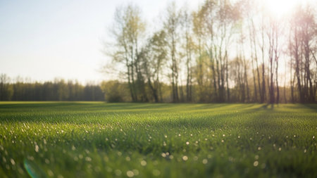 Lush green grass with sparkling dew drops is captured in soft sunlight, creating a serene and natural meadow scene.