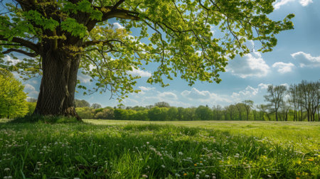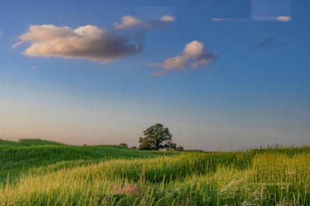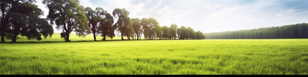 Green field, tree and blue sky. Great background, web banner. Electrical illustration