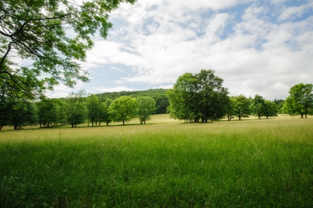 Idyllic landscape with fresh green meadows. Idyllic countryside.