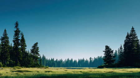 A calm and picturesque landscape featuring a tranquil lake surrounded by lush green grass and tall pine trees under a clear blue sky invites a sense of peace and nature.