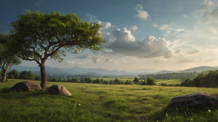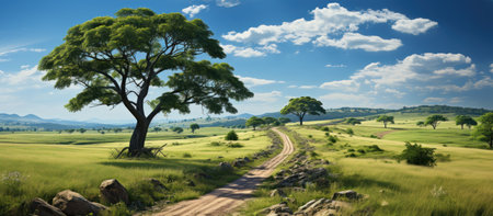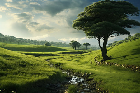 Landscape view of one big tree on the top of the hill with green grass on a hillside with blue sky and clouds in the background. Generative Ai