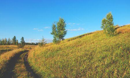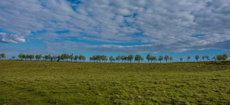 Beautiful summer landscape with meadow, trees and blue sky with clouds