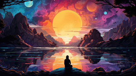 Fantasy landscape with man meditating on the lake.