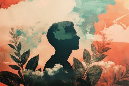 Abstract illustration showing mindfulness through nature with silhouettes and plants in harmony.