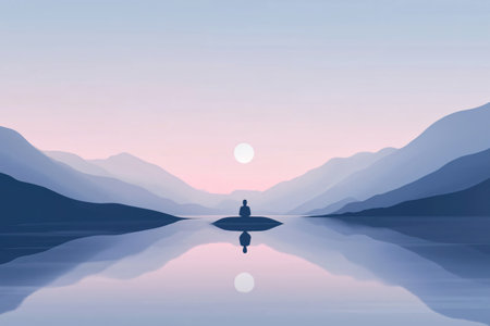 Silhouette of a man meditating on a rock in the middle of a lake with a mountain landscape in the background at sunset
