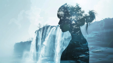 This stunning double exposure illustrates a woman's profile merged with a serene forest landscape, embodying beauty, calmness, and the connection between nature and humanity.