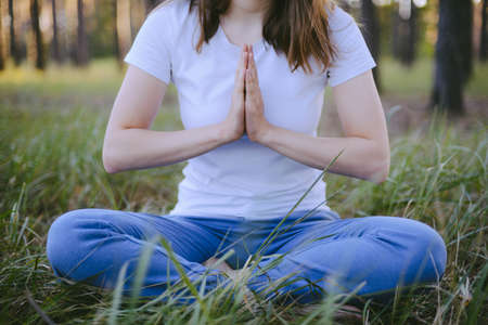 woman practices yoga and meditates in the lotus position on the nature. Girl Meditate at the forest. Woman meditating in the lotus position closeup