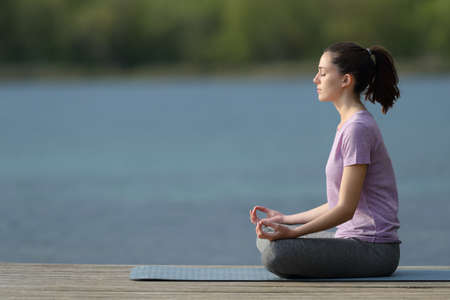 Young woman sitting in lotus position and practicing meditation near water in the nature