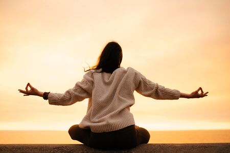 Girl meditation on the beach at sunset. Healthy outdoors lifestyle