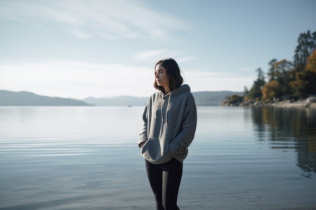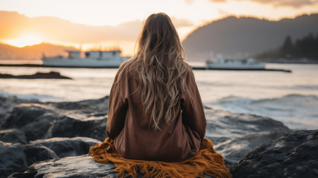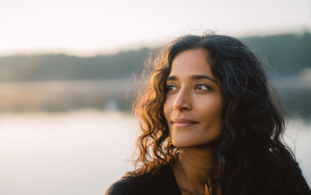 A woman sits by a lake at sunset. She gazes thoughtfully at the water with a soft expression. The trees in the background create a natural setting.
