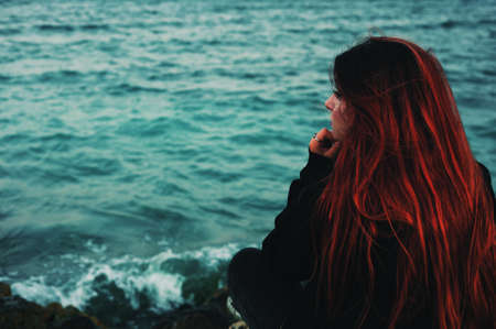 Long-haired young girl waiting for the sunset with the ocean in the background. Sunset with a calm sea in Puerto de Mogán, Gran Canaria island, Spain.
