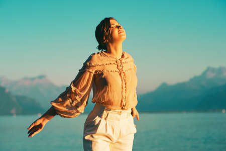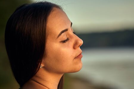 Beautiful girl on the nature near the green shore. Enjoys the setting sun. The concept of outdoor recreation, a walk in the park. Relaxation from the bustle of the city.
