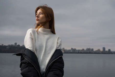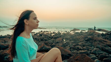 Closeup relaxed girl looking gloomy nature sitting seashore hill side view. Profile of meditating woman enjoying cloudy morning outdoors. Attractive serious lady making breathing exercises outside